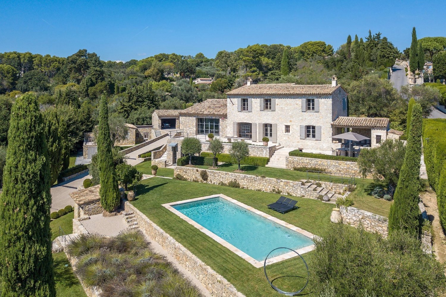Mougins - Exceptionnelle propriete dans quartier residentielidealement situee dans le secteur le plus recherche et residentiel de Mougins, a quelques minutes du vieux village, cette exceptionnelle propriete d'environ 540m2, a ete entierement renovee et agrandie dans un remarquable melange de materiaux anciens savamment niches et de conforts moderne. Beneficiant d'une epoustouflante vue panoramique sur la mer et le village, la maison principale offre de belles et lumineuses pieces de receptions, 4 belles suites ainsi qu'un salon cinema et une salle de sport. La maison d'amis dispose quant a elle d'un salon, d'une chambre et d'une salle de douche. Au coeur d'un jardin de plus de 5000 m2 aux restanques en pierres seches complantees de nombreux oliviers, et lavandes, la propriete comprend egalement une piscine et un abri pour 3 voitures.