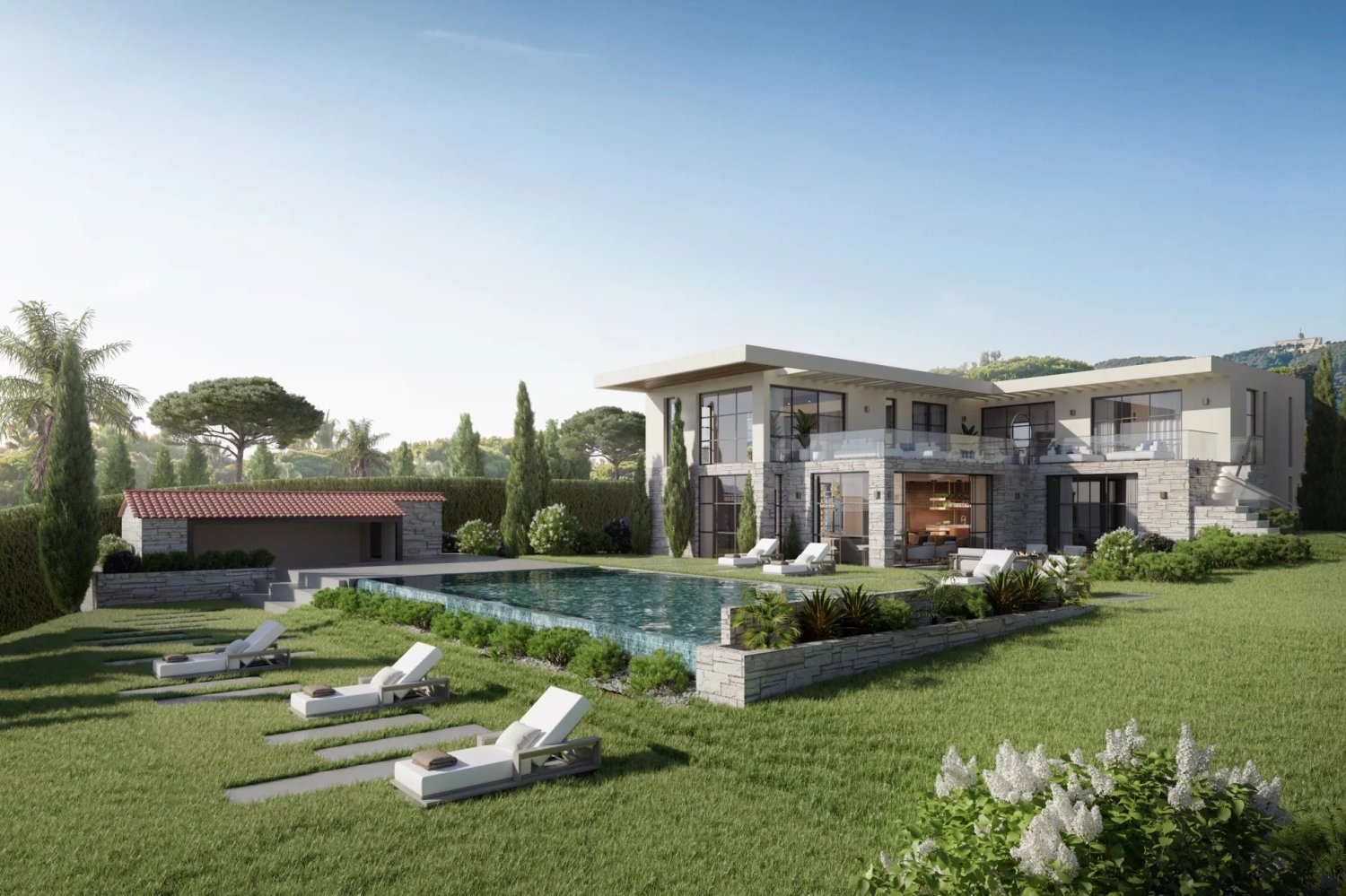 Super-Cannes - Villa contemporaine avec vue mer panoramiqueUne allee prestigieuse vous mene vers cette sublime villa contemporaine de 450 m2, lotit sur un terrain de 2 090 m2 dans un domaine prive et securise sur les hauteurs du Super-Cannes et beneficiant d'une vue exceptionnelle a 180 degres sur le Cap d'Antibes, la mer et les Alpes.