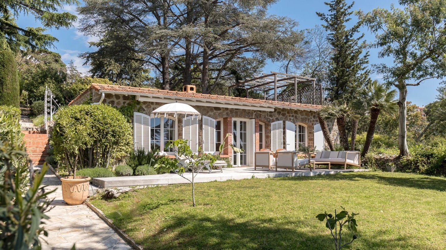 La villa jouit d'un jardin totalement privatif clos de 500 m2 et offre un environnement unique avec vue panoramique sur la mer et l'Esterel.