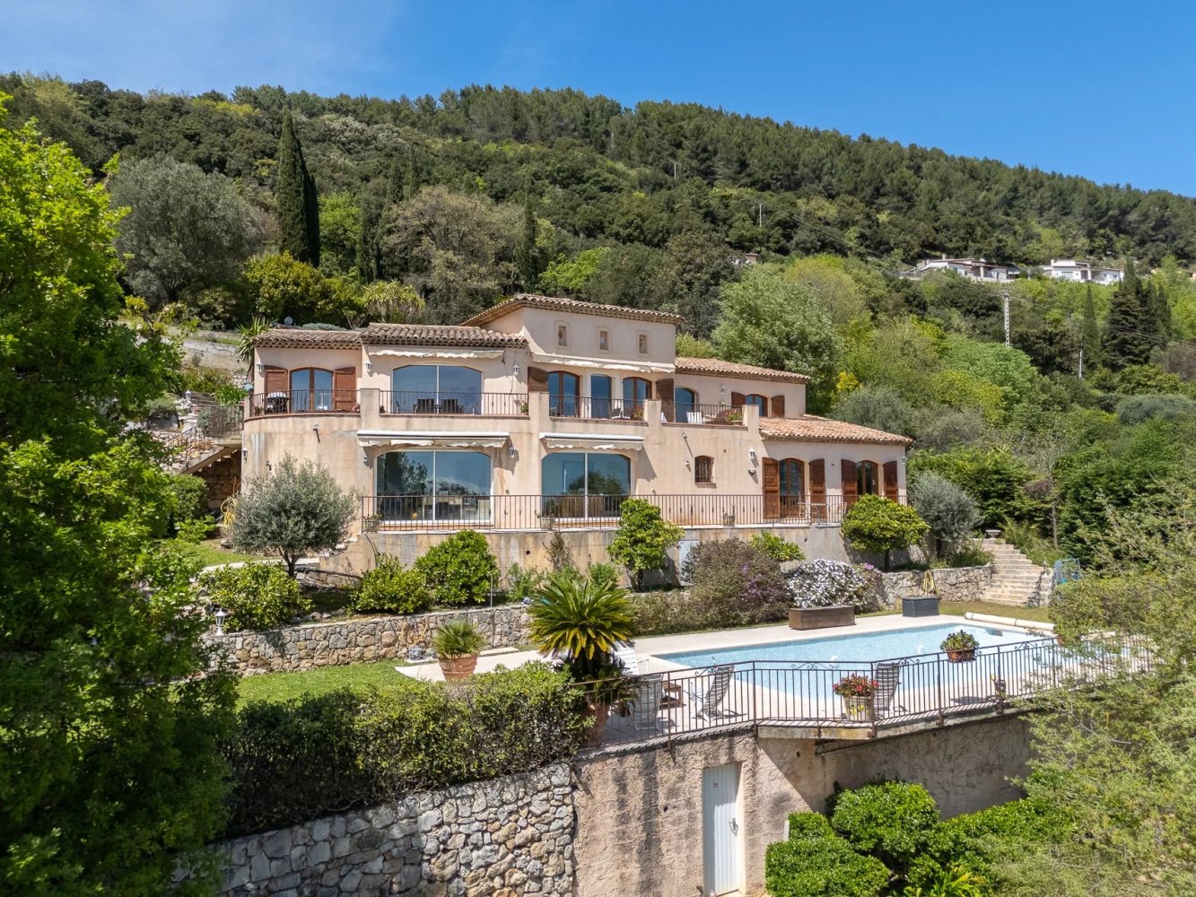 Villa with panoramic sea viewBreathtaking views from this 240 m2 villa, featuring a 50 m2 living room with fireplace, 5 bedrooms, a bathroom and two shower rooms, all on one level with the terraces. The garden is well irrigated and bathed in light, with a heated tiled swimming pool. The well-irrigated, floodlit garden features a heated, tiled swimming pool. The village of Cabris and the superb skies await you in this peaceful setting in a highly sought-after area. Garage and car parking complete the property.