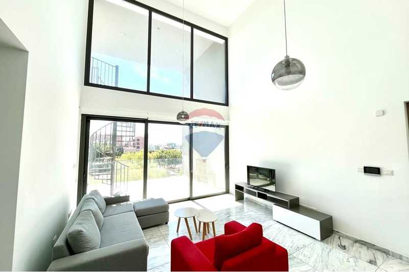 It features an open-plan kitchen, dining, and living area with 6,5 meters ceiling, 2 Bedrooms (one of which is a master bedroom en suite), and one bathroom.