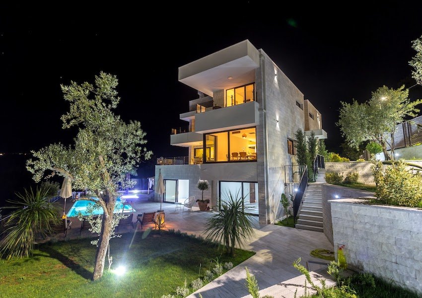 Modern villa with a landscaped garden is located in the quiet village of Djenovici, surrounded by lush vegetation and is 2.2 km from the beach and luxury complex of Porto Novi.The villa features: a spacious living room, a fully equipped kitchen, 5 bedrooms, 4 bathrooms and 2 guest toilets, beautiful terraces with stunning sea views, a Laundry room and a technical room