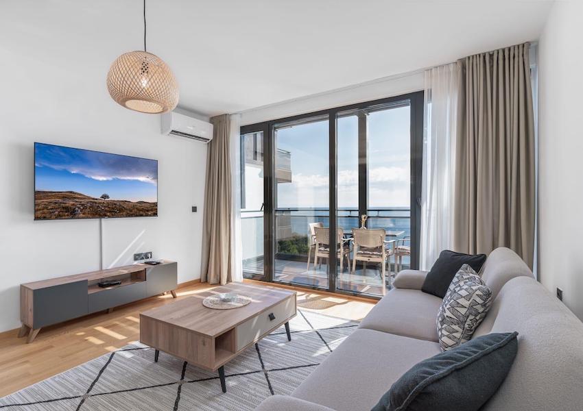 This charming two-bedroom apartment comprises 2 bedrooms, living room with dining room and kitchen, two bathrooms and a terrace.The apartments is located on the fourth floor of a new building in Sveti Stefan, only 100 m from the beach. Set in a quiet location, surrounded by greenery, with amazing views over Sveti Stefan island and the sea. This complex of apartments has a unique concept that combines luxury and homelike warmth. Open concept living space with abundant light intake and amazing views of the crystal clear Adriatic Sea visible through floor-to-ceiling sliding glass doors that lead to the outdoor balconies.