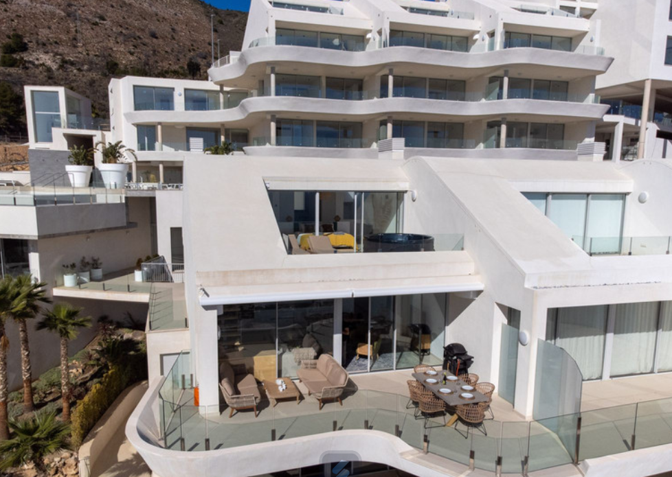 This duplex penthouse was build in 2020 and offers an bright open fully fitted kitchen in combination with the living and dining room, the living area is fitted with large windows leading out to the lower terrace from where you have an unbelievable view to the Mediterranean sea and the coast. 2 good sized bedrooms with wardrobes. Bathroom with a shower. On upper level you will find a big master bedroom with en suite bathroom and loads ag closets, big windows leading out to the upper level terrace with a jacuzzi and amazing views. Fantastic penthouse Stupa Hills has hot/cold air condition fitted throughout the property.