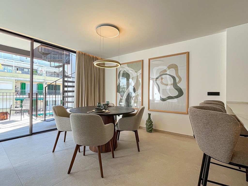This new modern development is being built in one of the most popular areas of Palma, within walking distance of the old town in Santa Catalina. Sports clubs, shops, and the city’s liveliest spots are all within walking distance, placing the residence at the center of the city’s vibrant life. The development includes 25 apartments, including several duplex penthouses with rooftop terraces, offering high-quality homes with modern solutions. Apartments range from 1 to 3 bedrooms, featuring spacious bright kitchens, open terraces, and underground parking. This penthouse apartment offers 3 spacious bedrooms with built-in wardrobes, 3 bathrooms, a separate laundry room, and a very spacious open-plan living room with a fully equipped modern kitchen. It also has access to a huge private rooftop terrace of approximately 100 m². The residence features a closed communal area with a swimming pool, fountains, a beautiful garden, and sunbathing and relaxation zones. Additionally, the complex includes a fully equipped gym and a beautifully designed lobby area. Owners can choose from several interior design styles specially prepared for them. Call or message us today for further consultation on this property! Do not hesitate to contact GRUPO TERRASUN for any additional information or to arrange a private visit.
