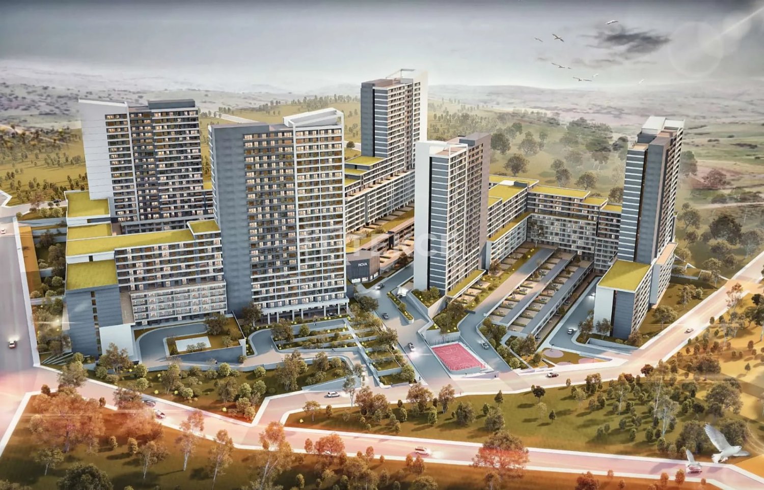 The project has a planned layout with landscaped areas and shared spaces that residents can benefit from. The complex features indoor and outdoor parking areas, basketball and football courts, as well as amenities such as a spa, sauna, and Turkish bath.