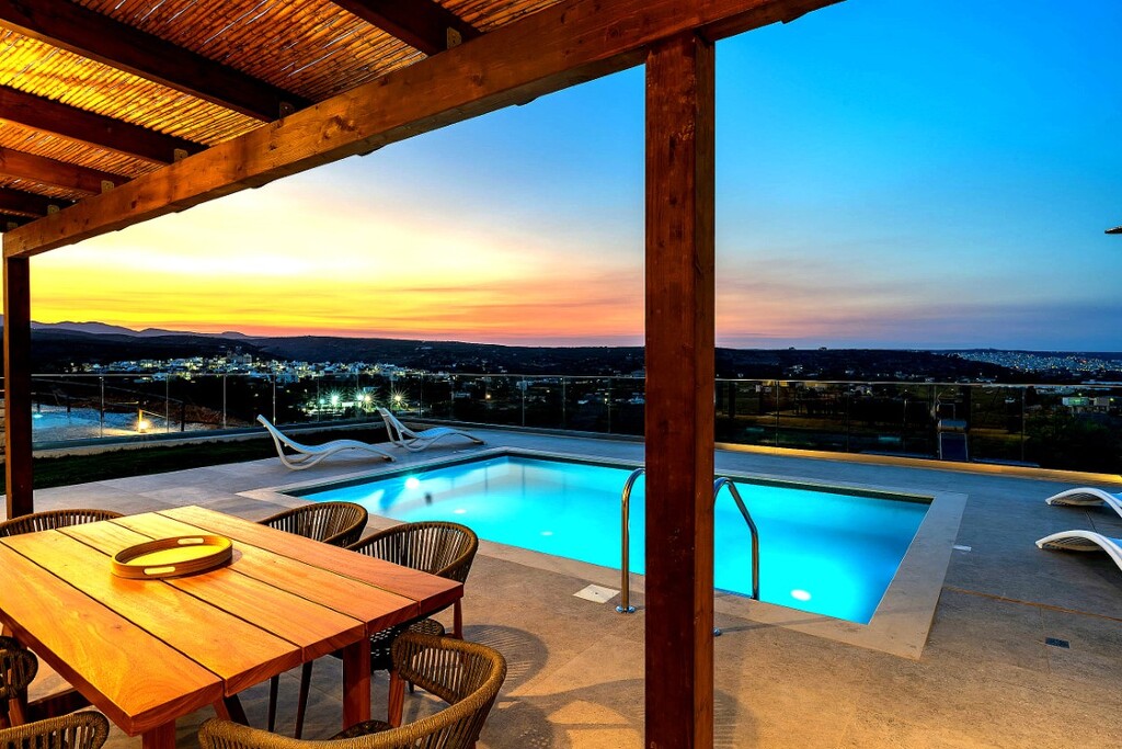 For sale 1-storey villa of 95 sq.meters in Crete. Villa consists of 2 bedrooms, living room with kitchen, one dining room, 2 shower WC.A magnificent view of the city, the sea, the mountain, the forest opens up from the windows. There are: solar panels for water heating, air conditioning, heating. The owners will be leaving the furniture with the sale. There is an alarm system installed. Extras included with the property: parking space, garden. The property boasts a swimming pool of private use.