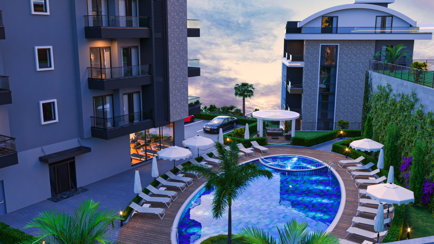 The project in Alanya on a 1,079 m² plot consists of 32 apartments in one block. The complex includes a pool, gym, hammam, sauna, and various social facilities. Details