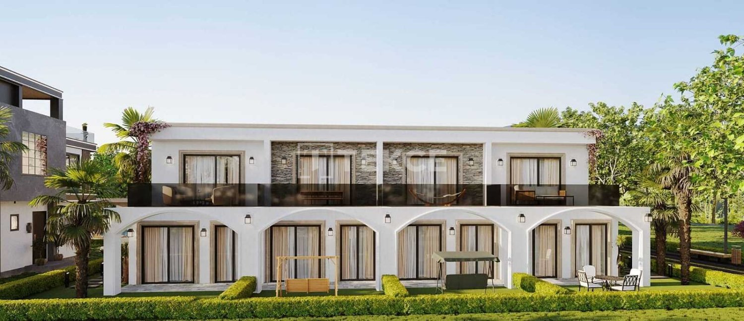 The apartments, located within the complex that embraces an independent lifestyle, have a private garden area. The apartments are equipped with double-glazed PVC systems for sound and thermal insulation. Moisture-resistant ceramics are used for wet floors. Apartments with open-plan kitchens have air conditioning, satellite, and internet infrastructure. On the ground floor, there are living rooms, kitchens, toilets, and terraces, while the upper floors have bedrooms and toilets. Built-in wardrobes are available in all rooms. The apartments, situated in a quiet and peaceful neighborhood within walking distance to all amenities, offer a serene and peaceful living opportunity without disconnecting from city life, as Girne city center is a short drive away. ECN-00383