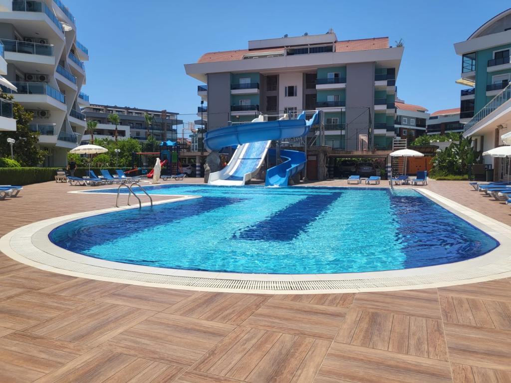 Large outdoor swimming pool with slides