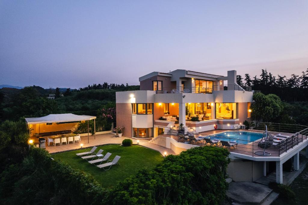 An exquisite villa of 520 sq.m. set on a serene private land of 2,800 sq.m. offering complete privacy and spectacular views of the Cretan Sea.This impressive estate is steeped in the lush nature of the popular tourist region of Platanias. Surrounded by sweeping fields of green, the property feels far enough from all the hustle and bustle of the touristy coast while in reality, it is just 3 km away from the sandy beach and the crowds. Luckily, no unwanted noise can reach this perfectly situated property and spoil the unmatched views of the sea, the mountains and the green surroundings, offered by the high ground of the plot.