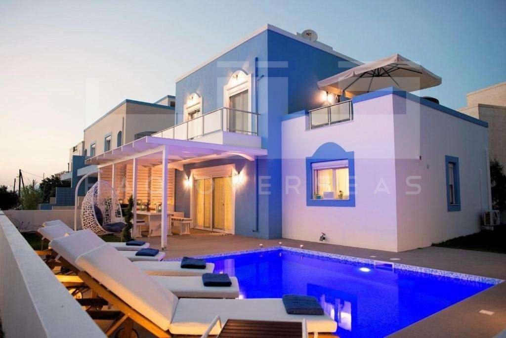 An ideally located sea view villa in Kos ifor sale. Situated in the beautiful village of Mastichari this perfectly maintained villa is only a short walk from a secluded sandy beach. Built in 2015 and only 100 meters from the sea front, this 200sqm villa offers 'walking distance' access into an almost secluded beach and long leisurely strolls along a beautiful beach side promenade. With its shabby chic modern style and highly practical and generously proportioned exterior space being complemented by an amazing private pool, it offers lots of relaxation time if you also consider the outdoor jacuzzi that was recently added on the upper floor. On the ground floor you can find the main bedroom, the kitchen with a dining area which flows on to a living room. The kitchen is fully equipped with cooking facilities, oven, fridge and washing machine. The large dining table can sit up to 8 people. Next to the dining area, a comfortable lounge includes 2 sofa next to the TV area and across from the large windows overlooking the pool area, garden and sea views. The large windows allow you to enjoy throughout the day the infinite blue of the sea and the beauty of the Greek sky and sun. Directly in front of the living area lies a large covered veranda with pergola. There awaits a comfortable outdoor lounge area with two traditionally built seating benches and a dining room for eight people. Next to it, the amazing swimming pool area where you can spend most of the day facing the amazing beach and the crystal clear waters of the sea. Commode deck chairs and umbrellas are in the pool and help you to enjoy the warmth of the sun of Kos. Fitted wardrobes provide even more space for the visitors. All around first floor, there are balconies with fantastic views to the garden and the sea where you can sit and enjoy your breakfast or a nice relaxing drink during sun-set. Also on the first floor you can find a large terrace ( around 25 sqm) where you can rest looking the sunset. On the 3° floor you can find a roof terrace for the most incredible view of the area plus you can use the new heated jacuzzi with stereo vocal controlled system The house's 350sqm private plot islandscaped with an amazing garden, bushes and various flowers offering fantastic greenery views. Kids can enjoy the space and the swings to play and adults can walk around and enjoy the sun, or use the amazing built Greek BBQ for outdoor cooking.