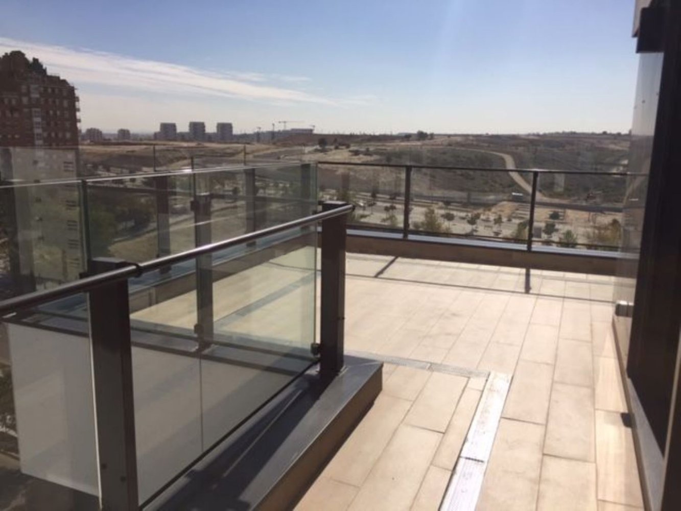 Living room, kitchen, two bedrooms and two bathrooms. Built to 99.43 metres, excluding terraces.On the main avenue of Valdebebas. Energy certification A. Ninth floor. In the first line of the park you can see the Central Park, the Forest Park and the control tower of Terminal 4 of Barajas Airport.The price includes two parking spaces.The two terraces of the living room and the kitchen are semi-connected, and one is completely square, which can be appreciated in large size in the plan view. The living room terrace faces east, south and west; there are no pergolas or other terraces above. Neither do they border any neighbours. The very thick glass balustrade extends all the way to the floor, which "extends" the light and the view. All this, plus the height of the floor, makes the house equivalent to an attic.Since all the rooms (even the skirting boards) have large windows, this house has light, sun and beautiful views.The windows also have a tilt and turn system for opening. Electric blinds. Underfloor heating. Air conditioning by ducts, individualized according to the room. (No heat pump). Sibel ventilation system. Many sockets and light switches. LED is integrated in the ceiling of the whole house.The kitchen has been added by the property (i.e. there is a partition option), and there are a total of eight metres of windows. The kitchen is not built in. It has integrated appliances and large storage cupboard. White lacquered units (seamless one piece door), lapitec worktops, Grohe mixer taps, detachable, with shower effect. The broom cupboard is integrated in the unit. Siemens and Electrolux Electric. The living room has an indirect lighting system (chandelier) and a plasterboard pit for fitting curtains/blinds. Two TV sockets to facilitate the furniture.Two bedrooms. The master bedroom has an L-shaped wardrobe as a dressing room. There are two bathrooms, one of which is en suite, a door is built into the wall and a shower room (there is also a shower head in the ceiling). The hall bathroom has a bathtub. All have built-in water tanks and hanging toilets, as well as Grohe taps (thermostats in showers and bathtubs).storage room.The price includes two parking spaces. The property also has a parking space in the same building. All are spacious, all in the basement. Therefore, you can sell one, two or three seats (subject to negotiation).The urbanisation has gyms, swimming pools, paddle tennis courts, landscaped areas, green areas and children's playgrounds with protective flooring; and day and night concierge services.The house is penthouse style because it has no other terraces at the top (or adjacent), but the property has three storeys set back).