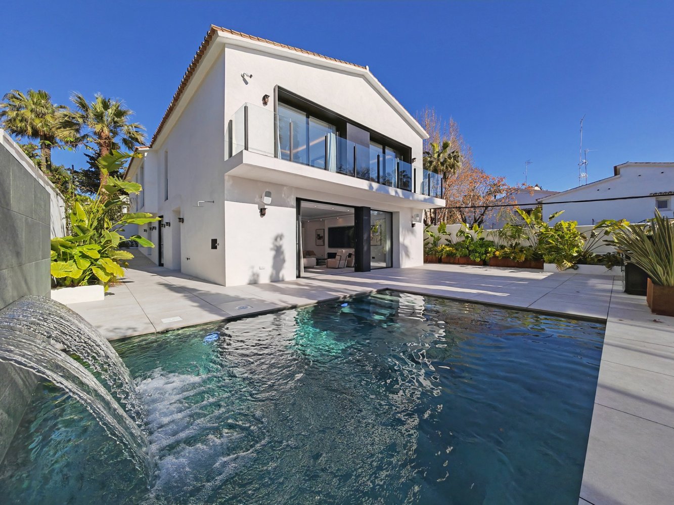 Immerse yourself in the epitome of luxury and relaxation with this stunning modern-contemporary villa in Nueva Andalucia, Marbella. Boasting ultra-luxurious finishes and a prime location within walking distance of beaches, shopping, and entertainment, this meticulously remodeled home offers sophisticated living at its finest.Featuring 5 bedrooms and 7 lavish bathrooms, each space is a private sanctuary of comfort and style. The gourmet kitchen is a chef’s dream, seamlessly connecting with the dining area for effortless entertaining. Enjoy evenings in the dedicated bar or private cinema, or unwind by the captivating swimming pool with a cascading waterfall.