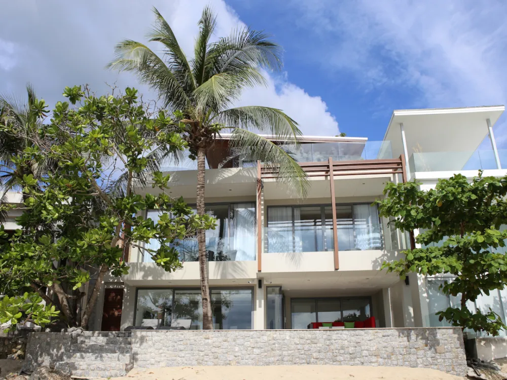 Three-storey villa with elements of Thai style in the interior. The villa has only three bedrooms, one of which has access to the roof. The other two bedrooms are located on the middle level, each with their own bathroom.The entire first floor is occupied by a living room, combined with a dining room for 8 people and an open kitchen with all the necessary appliances.