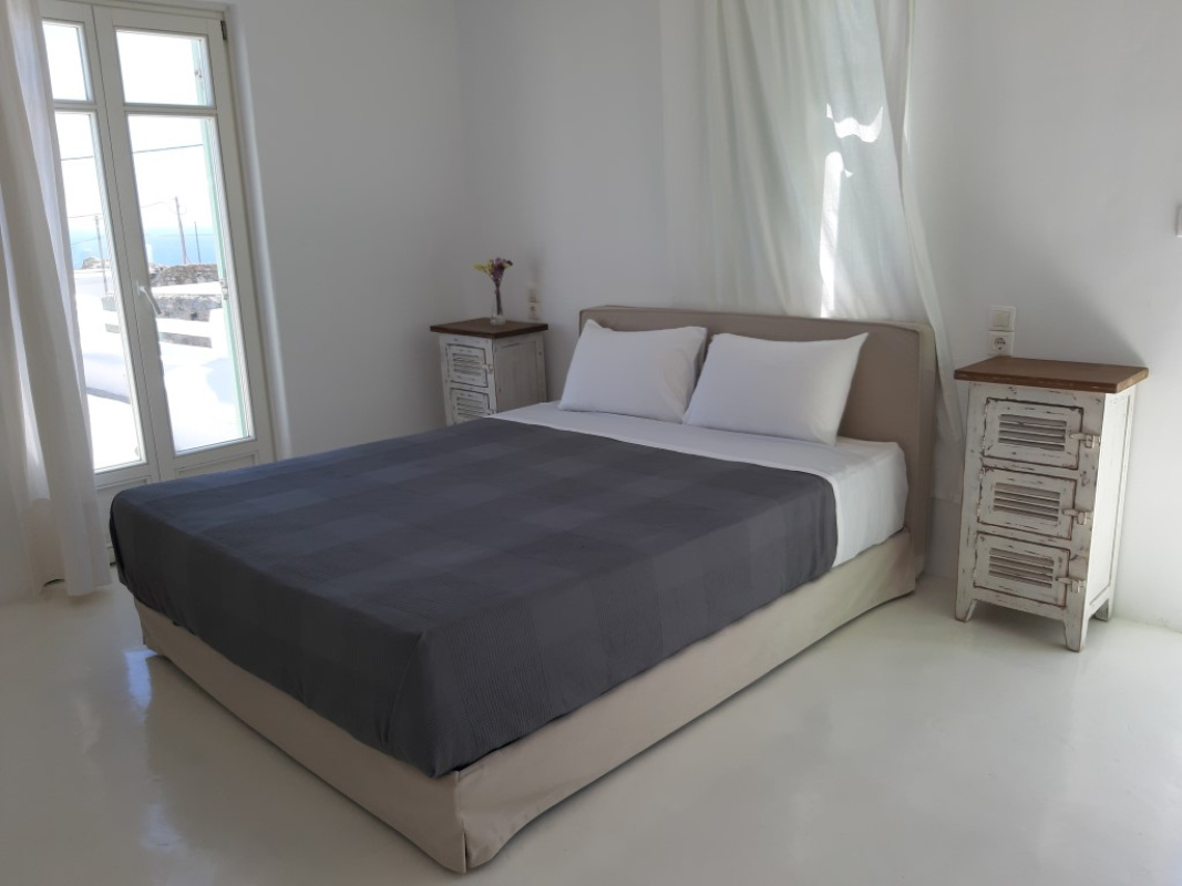This elegant villa is a state-of the-art-design, ideal for people with a fine taste for living. It consists of 2 bedrooms in the upper floor with en-suite bathrooms .Τhese bedrooms have access to a large veranda with a spectacular sea view. A third bedroom with en-suite bathroom is located on the ground floor. Another bedroom with en-suite bathroom is also located on the ground floor which is actually a large studio connected with the main house but also with its own entrance for extra privacy. A large living room is also on the ground floor with comfortable sofas overlooking at the swimming pool through a large window. Direct access is to the pool from the living room. An independent studio is located near the pool with a large double bed with en-suite bathroom, ideal for a couple. The private swimming pool with the comfortable sunbeds is ideal when you stay at home relaxing by the pool. There is an outside dining area under a shaded pergola with a large table where you can have breakfast, lunch or dinner under candle lights. The outdoor area is under a shaded pergola with elegant outdoor furniture. There is also a large stone-built sofa with a stone-built table where you can sit after your swim and enjoy the Greek sun with a nice cold drink. The white colored walls and furniture in the interior create a sophisticated atmosphere. One of the main characteristics of this villa is that all bedrooms have en-suite shower rooms with separate toilets which gives an extra privacy.The villa was designed by a famous Greek architect who combined the local Cycladic architecture with the modern design. The villa can accommodate 10 people, max 11. There is a parking space for 3 cars.