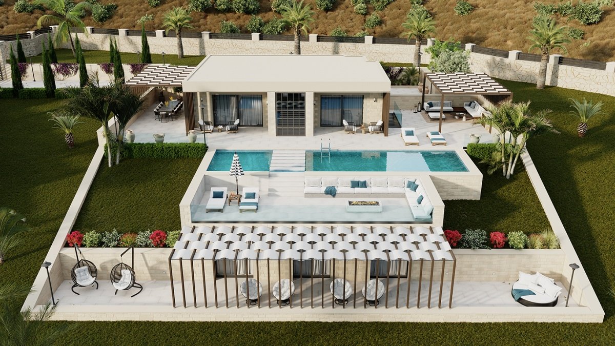 It will be built on a hillside in the center of a large piece of land according to the original layout. Visually, these are 2 separate buildings, passing from one level to another, between which there is a swimming pool and a comfortable seating area with a decorative garden fireplace and furniture.