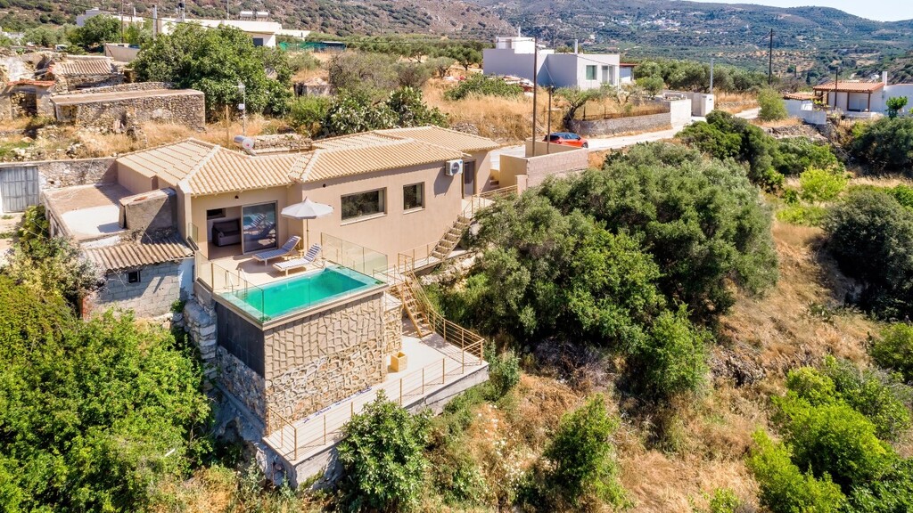 For sale 1-storey villa of 116 sq.meters in Crete. Villa consists of 2 bedrooms, living room with kitchen, 2 shower WC, 2 storerooms.A magnificent view of the city, the sea, the mountain, the forest opens up from the windows. There are: solar panels for water heating, air conditioning, heating. There is an alarm system installed. Extras included with the property: parking space. The property boasts a swimming pool of private use.