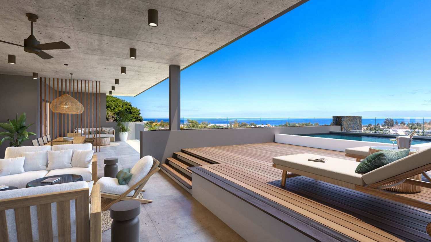 The covered terrace, a real jewel in the flat's crown, is the perfect place to relax and enjoy the great outdoors. A sparkling private pool provides a refreshing oasis, while dazzling sunsets over the horizon create an unforgettable backdrop for your evenings.