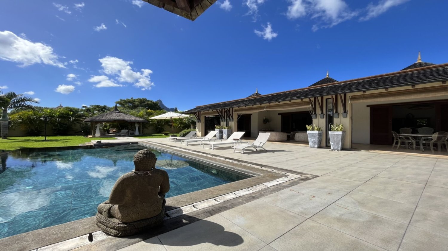 Exquisite 5 bedroom villa type A, set in the most prestigious IRS resort with 18 hole Golf and restaurants, in the west coast, with 551m2 house size and more than 3988m2 of garden area and including its own complete studio. Perfect finishes for this single floored villa with outstanding features, from the entrance alley to the kitchen area, laundry, living and dining rooms, ensuite bedrooms and the private terraces, it offers great comfort, fluid volumes with a delicate yet sober decoration. Its outside designed gardens offer parking spaces, 2 gazebos, and double garage in this prestigious Estate close to the Tamarina hotel and its amenities. Foreign acquisition with permit applicable.Contact the seller