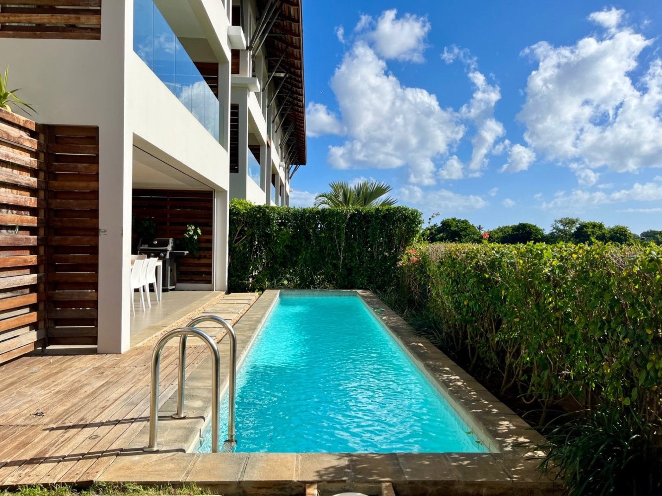 Located in the heart of Tamarin and its amenities, beautiful contemporary apartment fully furnished and equipped, includes immediate rental income, and offers spacious bedrooms, with two ensuite shower rooms, open-plan kitchen with bar, TV lounge and dining room opening onto a superb terrace with garden and private swimming pool, within a residence in RES, close to sports clubs, clinics, hypermarket and a few minutes walk from the bay of Tamarin. Single elevator to access the other levels of the block. With permanent residence permit.Features