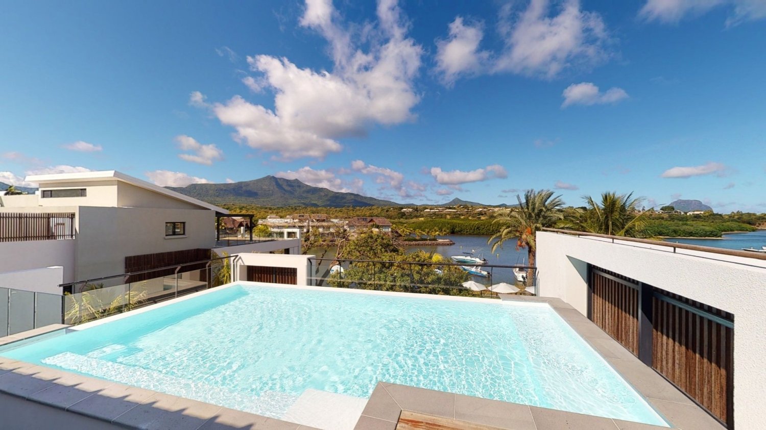 This beautiful 4 en-suite waterfront penthouse is located in ‘The WaterClub’ residence in Rivière Noire. With a surface area of 457m2, generous open plan living areas with panoramic views over the marina and the mountains, and a private pool, this penthouse is an oasis of tranquility ideal for a family looking for a lifestyle by the water.‘The WaterClub’ is a waterfront development on the west coast of Mauritius. It consists of 12 apartments, 3 exclusive penthouses and 7 optional studios. Common facilities include generous parking, a 16 m swimming pool and deck, a pool house and a lush tropical garden overlooking the marina and passing boats. ‘The WaterClub’ provides buyers with an exotic tropical lifestyle set within a marina environment. This development is accessible to foreigners.