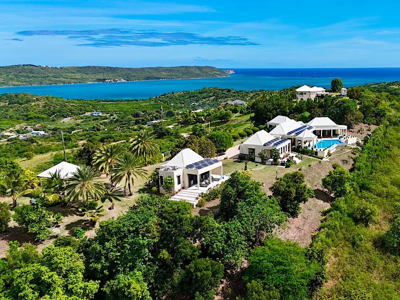 Savannah Ridge was designed by one of Antigua’s leading architects, OBMI in 2007 and is solidly constructed with 8-inch concrete and iron reinforced walls. The two-bedroom suites, the main residence consists of 3 attic storage areas, a walk-in laundry room, walk in audio/video room, walk in linen closet and 2 walk in closets off the entry way to the master bedroom. While the home is serviced with government power, it is mainly run off the home’s 44 solar panels: operating off individual micro-inverters converting DC to AC power and a 3.5 KVA wind generator. There is also a 35 KVA, John Deere diesel generator. Rainwater is supplied via the main house cistern of 31,000 gallons with a second cistern of 2,200 gallons feeding the garden and guest house. Two 100 lbs. propane gas tanks service the kitchen for cooking.
