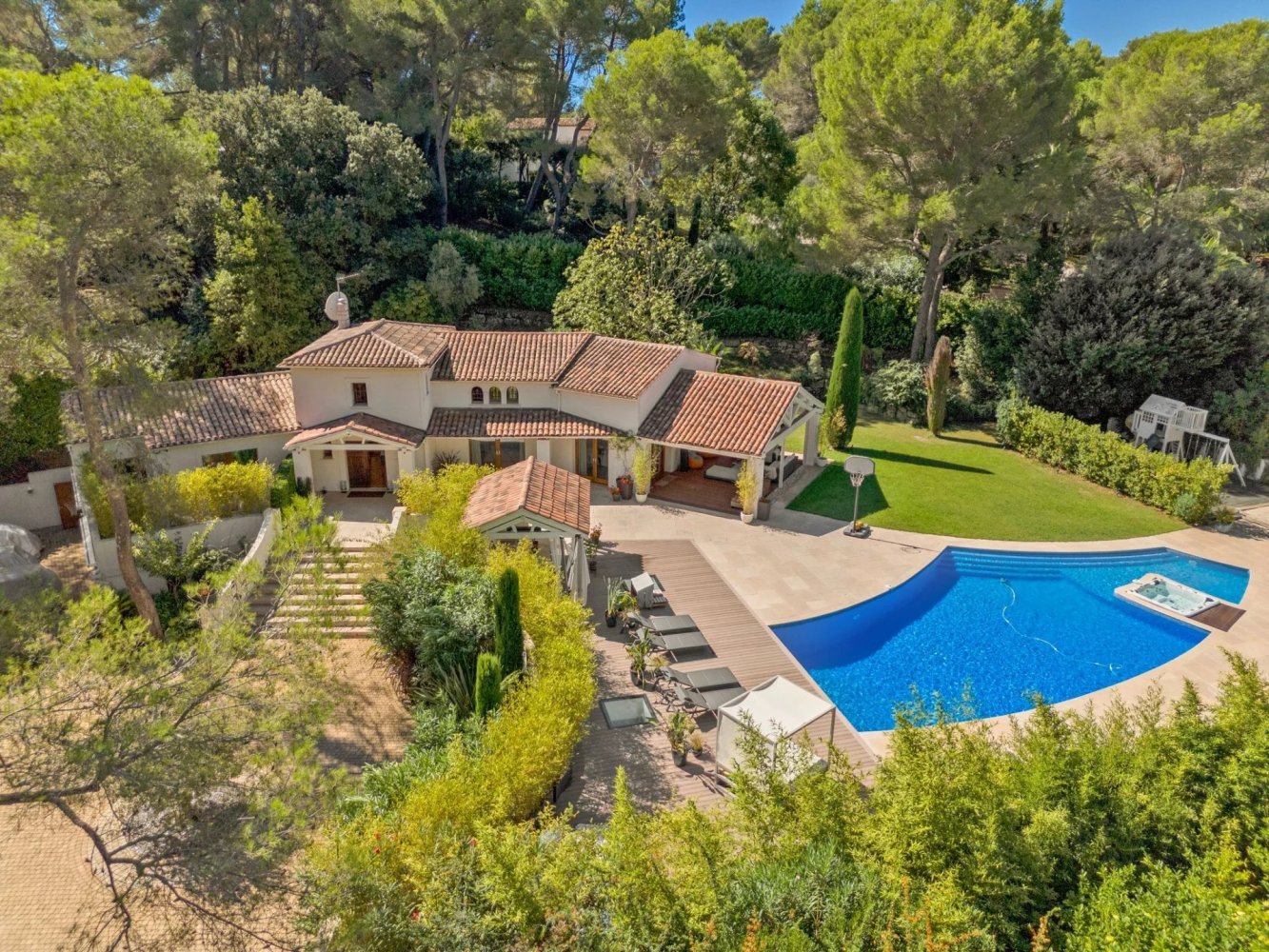 in the heart of one of the most residential and secure estates of Mougins, in a haven of tranquillity and surrounded by greenery, this superb property boasts top-quality fixtures and fittings and offers a very convivial quality of life, with the living space opening onto a large terrace with the swimming pool as well as a pool-house and the garden.