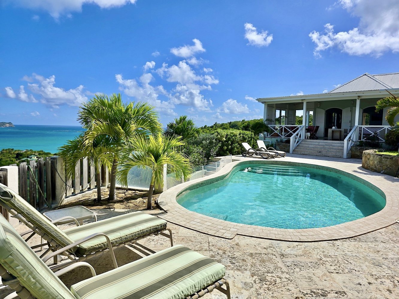The two spacious guest bedrooms on the lower ground floor offer glorious sea views with their own private verandas and are blessed with cooling breezes. With the swimming pool, outdoor living areas, and short downhill walk to Willoughby Bay, this home is an oasis of tranquility. A spacious garage for one auto is currently used as a woodworking shop by the owners. Above the rear half of the garage is a newly constructed artist studio. This space could easily be extended the full length of the garage to make for a fourth bedroom. And the 1-acre parcel could accommodate a nice guest cottage for additional living area, if desired.
