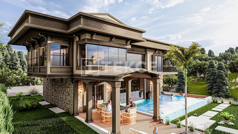 The detached villas for sale have quality interior and exterior materials, stone-coated interior and exterior walls, ceramic and wooden floor coverings, double glazing window systems, high ceilings and gallery space, wooden veneered stairs, island type kitchen and kitchen cabinets made of quality materials, fireplace, electric blinds, air conditioning, five built-in kitchen equipment, outdoor parking area, wooden bay window balconies and garden terraces with sea and nature views, and detached garden use.