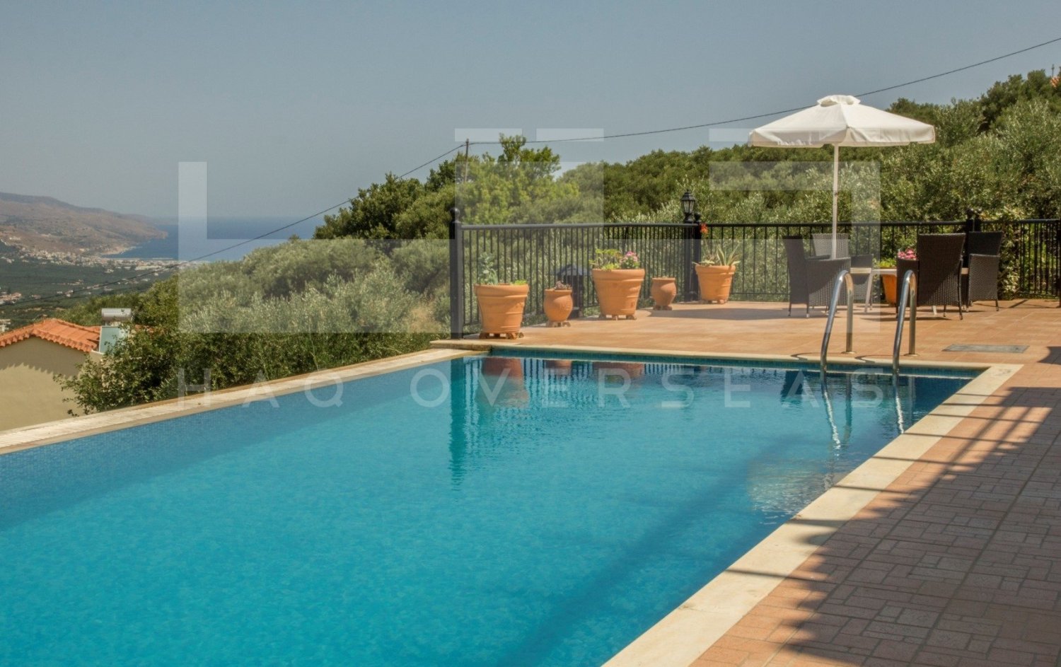 This is a spacious villa for sale in Kolymbari, Chania, Crete, located in the village of Vouves. The total living space of the villa is 148 m2, sitting on a 1000 m2 private plot, offering 5 bedrooms and 4 bathrooms. This 3 level property features on the ground floor a fully equipped fitted kitchen and dining area but also an airy and bright living room and a bathroom. The upper floor consists of a double bedroom with its balcony, providing unobstructed stunning views of the sea and the mountains. One more double bedroom and two ensuite bathrooms also exist on this floor. Additionally, the lower level of the villa offers 2 bedrooms and a laundry area, but also a bathroom and storage space under the stairs. The property is fully fenced with beautiful stone boundary walls and enjoys open views of the sea and mountains at every corner. Also, it boasts a private heated infinity swimming pool and a landscaped garden, creating an ideal environment for tranquility and relaxation. HiGHLiGHTS Living Space 148 m2 Plot of 1000 m2 5 Bedrooms & 4 Bathrooms Mountain & Sea Views Heated infinity Pool Central Heating Air-condition Units Landscaped Garden Storage Room Vouves is a rural settlement built on a hill offering panoramic views of the Cretan sea and countryside. it is a green area and it is very well known for the oldest olive tree in the world, aging over 3000 years and still producing olives. The beaches of Tavronitis & Kolymbari are just 7 and 8 kms away, where also all kind of amenities can be found.