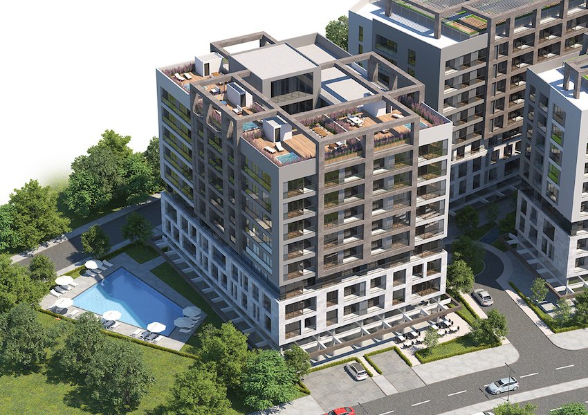 The apartments for sale in North Cyprus Girne are located within a complex. The complex includes various amenities such as a shared swimming pool, wellness center, aquaponic garden, and more. Details