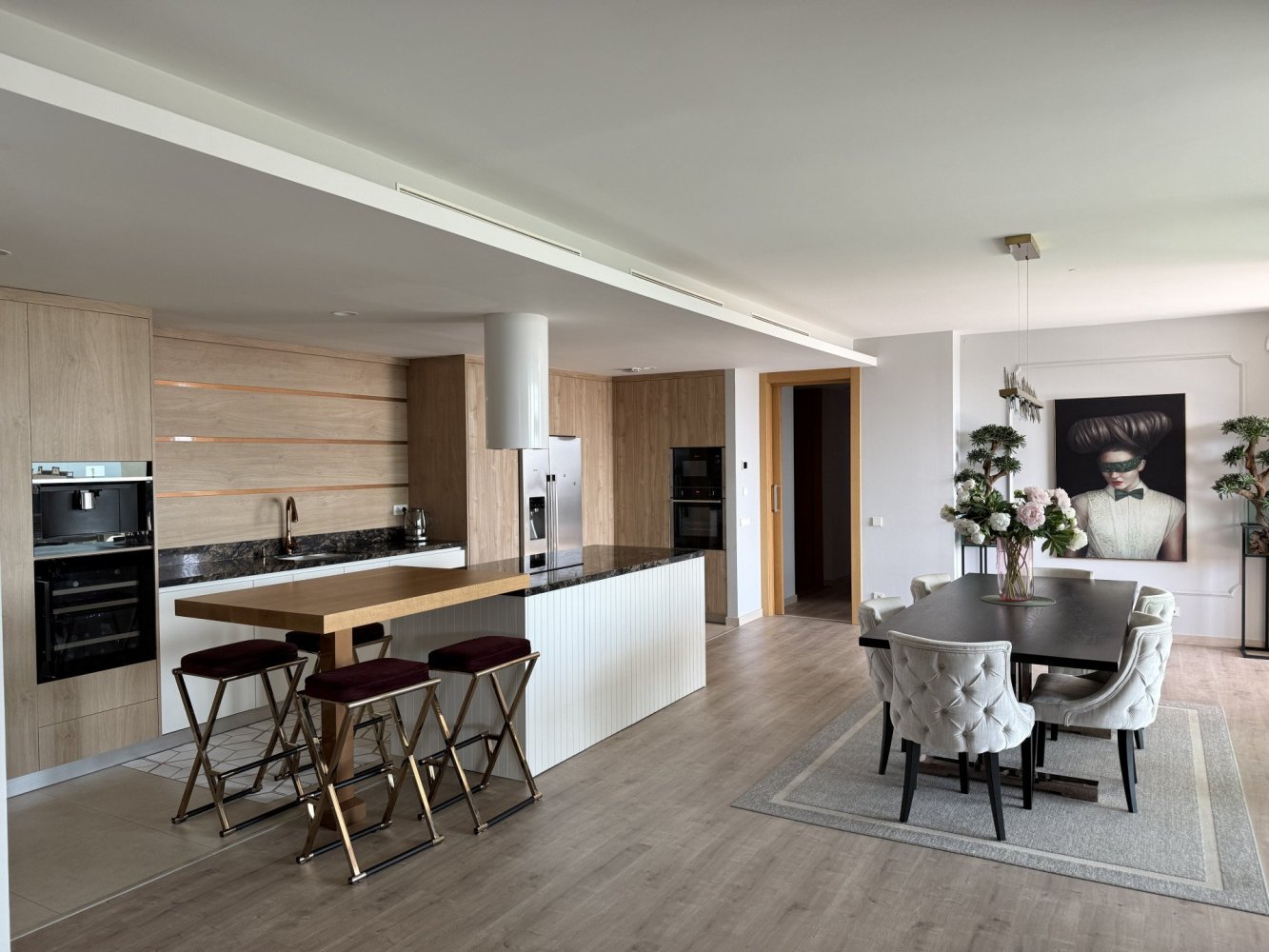 The intelligently designed layout ensures privacy and convenience, with 2 bedrooms on one wing and the master suite plus an additional bedroom on the other. The bright and airy interiors feature bespoke finishes, high-end materials, and a state-of-the-art kitchen with a cooking island and breakfast bar