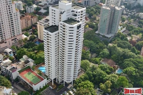 A spacious two bedroom, three bath condo in the Baan Suanpetch is currently being offered for sale. The apartment is situated on the 14th floor and has wonderful city views from the living room and bedrooms.The open living plan includes the living room with a sofa, two chairs and white built in shelving. Adjacent is the western kitchen and dining area that seats four. The kitchen includes a stovetop, oven, microwave and a refrigerator. In addition there is a utility room with a washing machine.