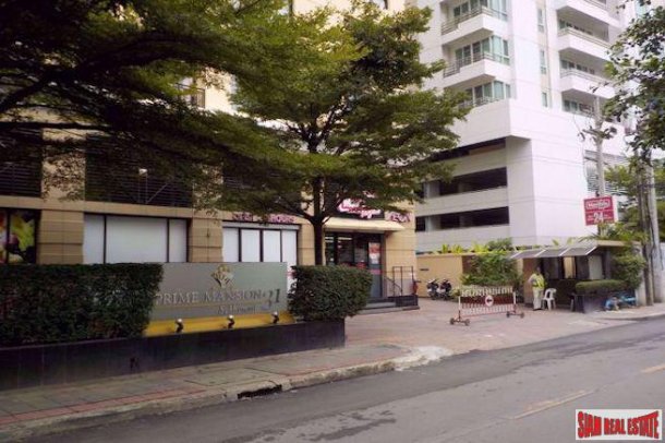 Two bedroom pet friendly condo for sale in Phrom Phong. The building is very private with only 70 units. The apartment has been recently renovated with good materials, wood flooring and nice modern furniture.The living room has a comfortable sofa, wall mounted flat screen TV and a dinette set for two. This room opens out to the balcony. There is a separate kitchen area with appliances including a stovetop, oven, microwave, refrigerator and washer/dryer. This room has wooden cabinets and a breakfast bar with stools.