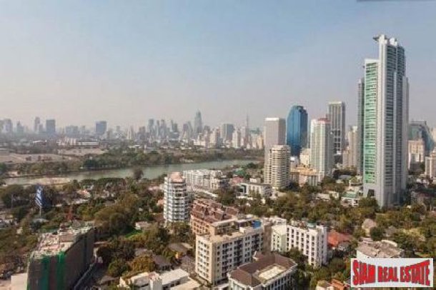 This is a deluxe corner apartment for sale on the 23rd floor of the Aguston Sukhumvit 22. The fully furnished unit is 152 sqm and has three bedrooms, three bathrooms and a guest toilet.The open living space includes a living room, dining room and kitchen. The living room has a comfortable sofa, two chairs and a TV and it leads out to the balcony. The dining table seats 10 and it is adjacent to the Western kitchen which makes entertaining easy and fun. This kitchen has many light wood color cabinets and an island style work station. It is fully equipped with a stovetop, microwave and refrigerator. There is a second Thai kitchen available in the rear of the apartment.
