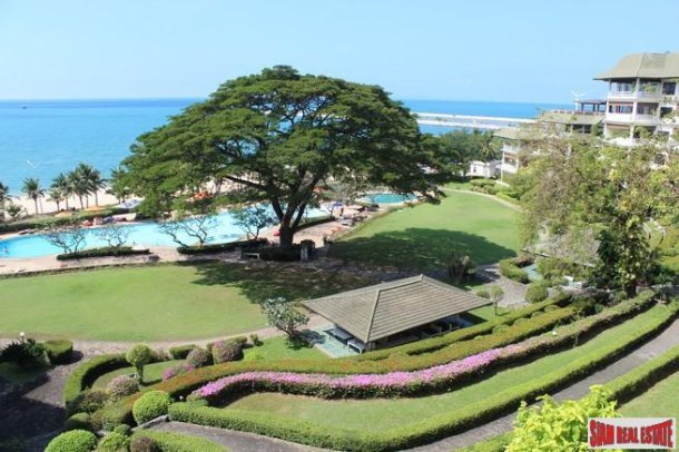 This is a magnificent three bedroom, two bath condo in the Baan Somprasong. It is very spacious at 210 sqm and has remarkable views of the ocean and pool.There is an open living plan that includes an elegantly decorated living room, dining area and western kitchen. The kitchen is amazing with a stovetop located in the center of the L-shaped kitchen, making it a center point of the kitchen. There is a double door refrigerator, a separate work counter and a breakfast bar with stools.