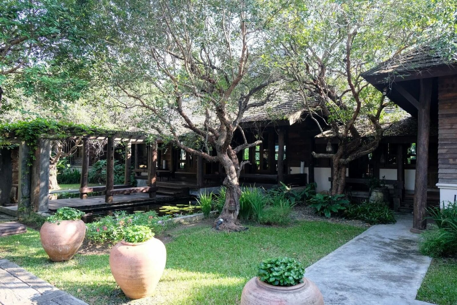 Unique 3-bedroom, single-story teak house just south of the airport for sale. The house is built along a small artificial lake, has a large garden with maid’s quarters, sala, large lakeside deck, and elevated meditation room.The house is built around a large central living room which exits directly onto the large porch/outdoor dining area that overlooks the lake. The deck also has a lakeside Sala perfect for small gatherings. There is also a smaller formal dining area just off the western style kitchen. The master bedrooms with large bathroom is on the left wing of the house with the two guest bedrooms, both with en-suite bathrooms, on the other wing.Contact the seller