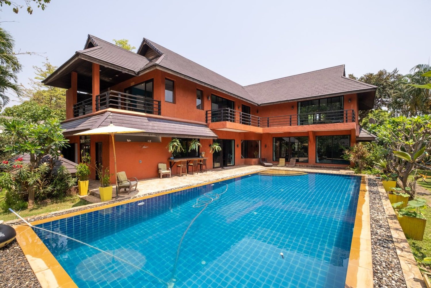 Large, 3-bedroom house with office and separate garden guesthouse with en-suite bathroom just outside of the city center 10 minutes from the airport for rent and sale.The main house forms an L-shape around the central 15m by 6m saltwater swimming pool. The first floor of the house has a large living room, office, and guest toilet. The poolside wing has a games area, dining area, and open-plan western kitchen. There is also a semi-finished basement 17m x 7m offers ample storage or additional space. There is also an attached laundry and Thai kitchen just off the western kitchen. The second floor has a large balcony, 3 bedrooms all with en-suite bathrooms, with the master bedroom featuring a lounge area, walk-in closet, en-suite bathroom, and balcony bathtub with a view over the gardens.The guesthouse, located at the far end of the pool in the garden, has a covered terrace, large bedroom, and en-suite bathroom. Ther is covered parking at the front for two cars, a high fence offering good privacy, and well-maintained gardens and mature trees.Contact the seller