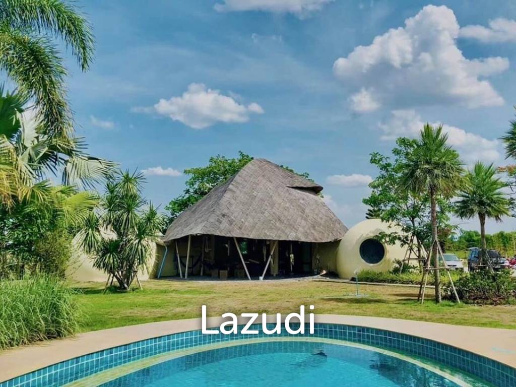 Discover the beauty of this one-of-a-kind, eco-friendly architectural masterpiece – The Artist Balinese Resort Home. Enter the front dome’s Hobbit door with mosaic benches and main room with soaring bamboo roof. This part of the project was engineered and built by Chiang Mai Life Construction (CLC), world renowned for adobe and bamboo construction (https://www.bamboo-earth-architecture-construction.com). The arched hallways lead to 2 dome bedrooms with round beds & mosaic window seats. The bathroom dome has a huge granite bathtub and mosaic octopus shower. There is a western kitchen, laundry, office and plenty of storage. Relax in hammocks, or fall asleep beneath the skylight and painted mandala.The property set on 2.2 Rais (almost 4000 m2 or 1 acre), the property boasts a salt water swimming pool, a sauna, an outdoor bathroom and shower, and a spectacular bamboo sala for holding workshops or courses. These features are connected by sandstone pathways and surrounded by beautiful tropical gardens and lawns.