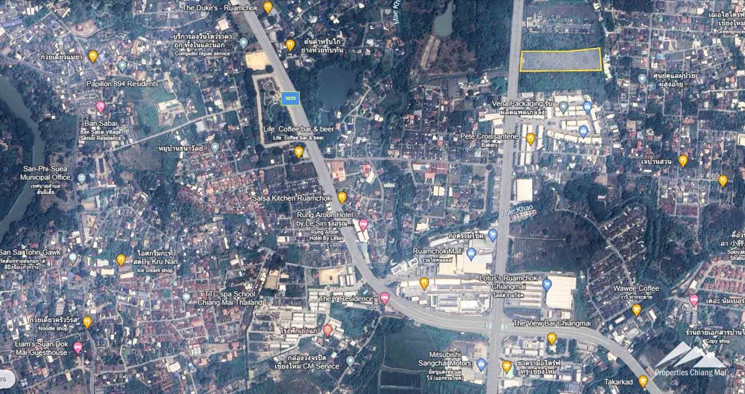 Conveniently located just 780 m. north of the Ruam Chok Intersection (Hwy 1001 & 3029) on the main Hwy 1001, this prime piece of land in San Sai is an excellent location for developments of various kinds.This plot is one of two plots (the southern plot) that combined make up 20 Rai, 180.6 Sq.wah (8,180.6 Sq.wah) (20-1-80.6) (Both plots combined = Property ID: PC-SAN004-A).