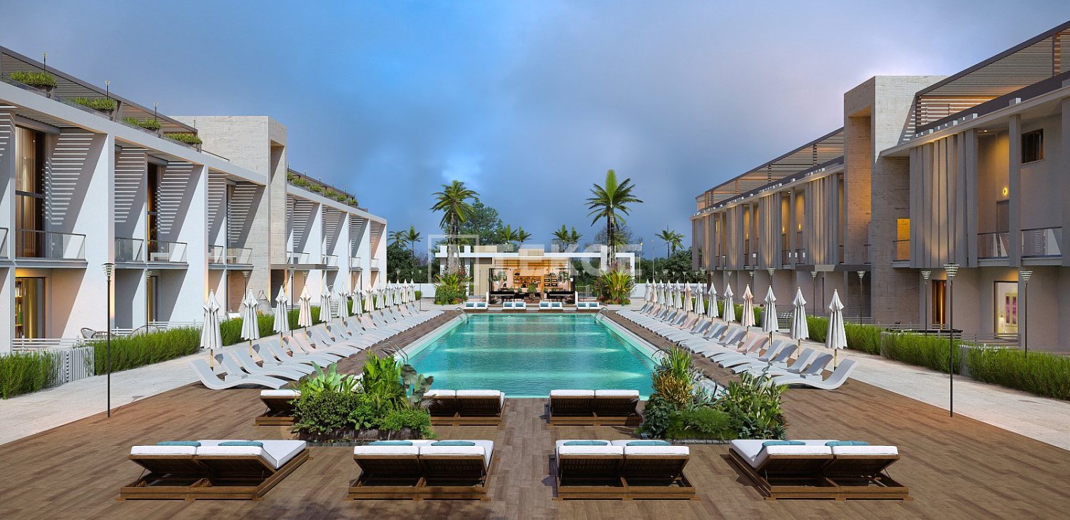 The apartments for sale are located in an advanced complex in North Cyprus İskele. The site features many advanced amenities such as a gym, spa, restaurant, café, heated pool, and more. Details