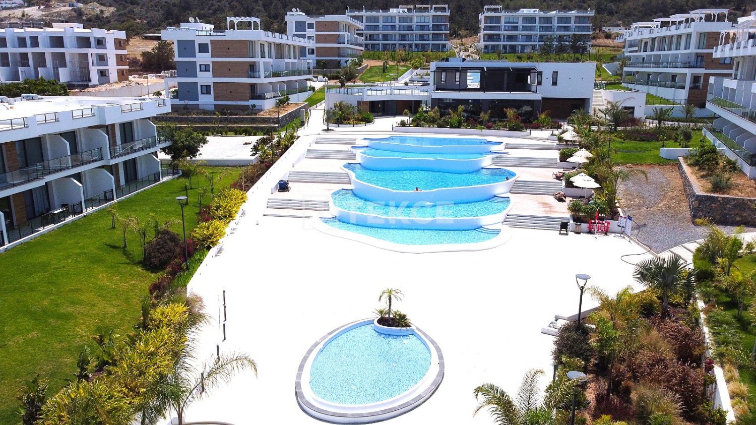 The flats in North Cyprus are located in a developed complex with walking areas, jogging tracks, sports fields, and a social club. There is a beach at the front of the complex. Details