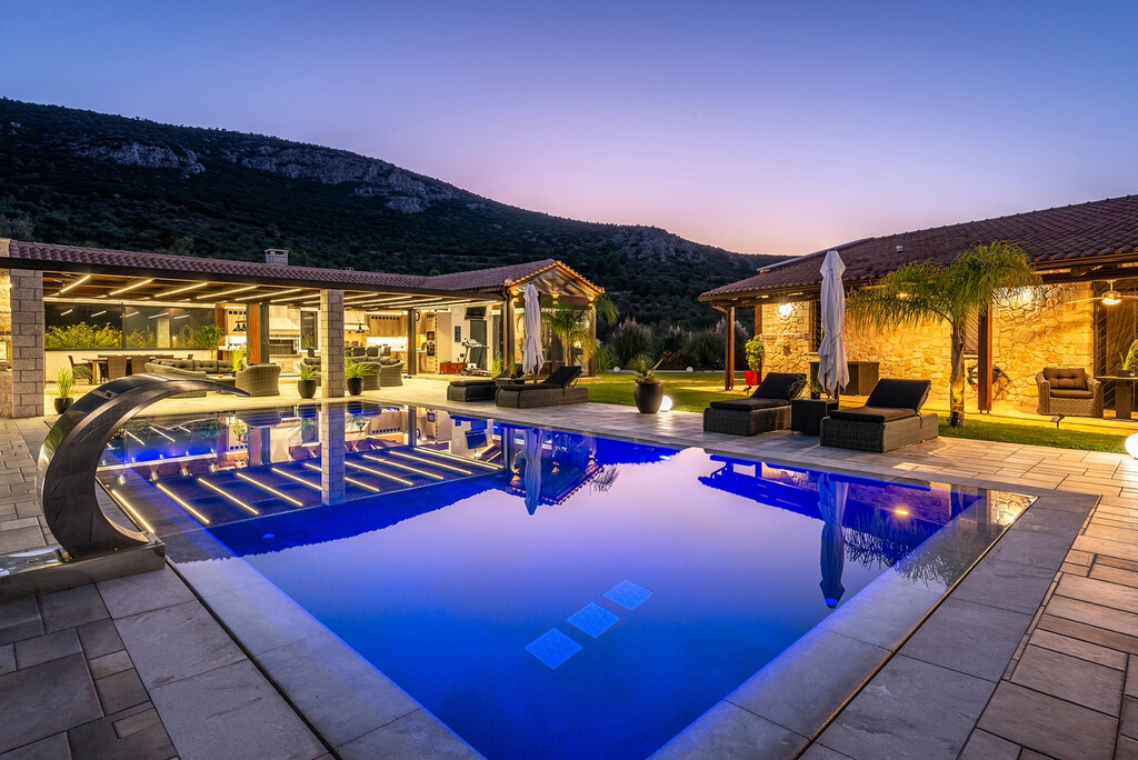 Продается 1-этажная вилла площадью 471 кв.м на полуострове Пелопоннес. Вилла состоит из 4 спальных комнат, 3 гостиных, 3 кухонь, 5 душевых комнат, одной кладовой, одного офиса, одного тренажерного зала, джакузи.Из окон открывается великолепный вид на горы, на лес. У объекта есть солнечные батареи для нагрева воды, камин, кондиционер, тенты, зона барбекю, отопление. Недвижимость продается с мебелью. У объекта установлена сигнализация. К недвижимости относится парковочное место, сад. На территории расположен бассейн личного пользования.